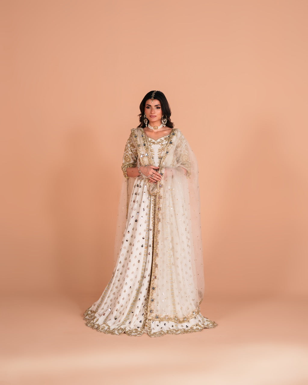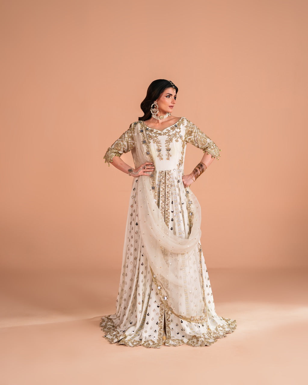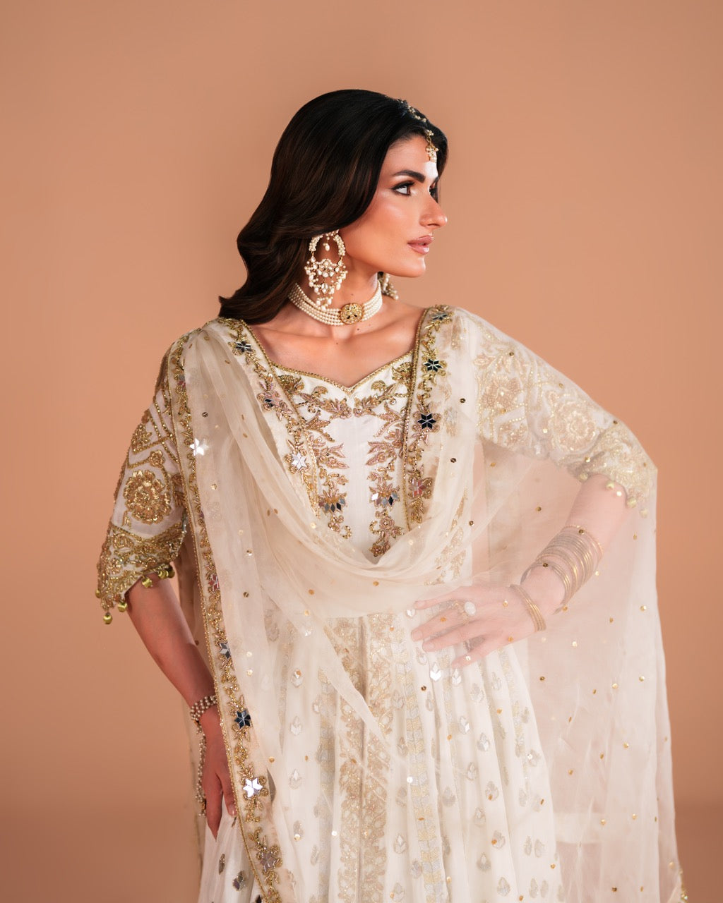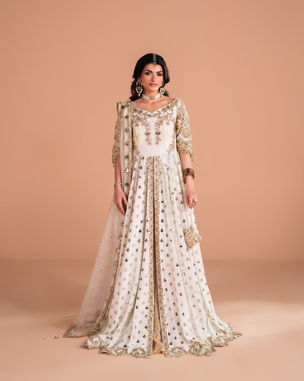 This ivory and gold ensemble weaves tradition with contemporary elegance — adorned with intricate handwork, mirror, delicate sequins, and a flowing silhouette that whispers luxury in every detail. Perfect for nikkah, day weddings, or regal celebrations