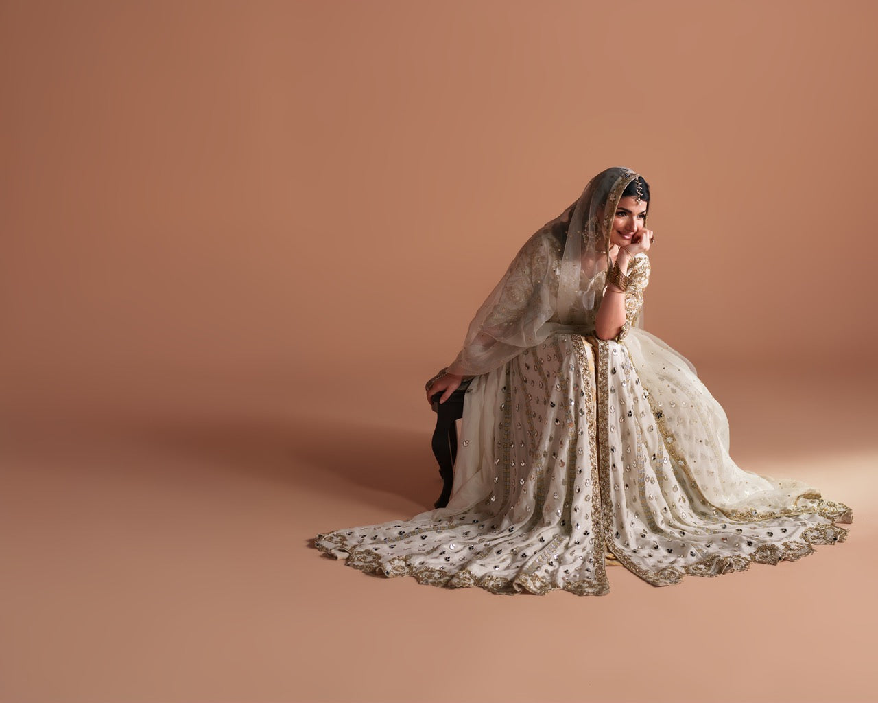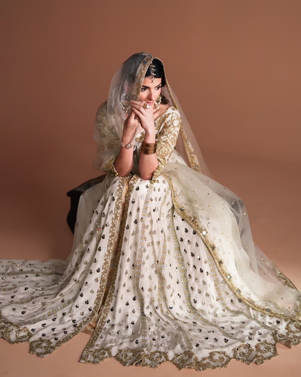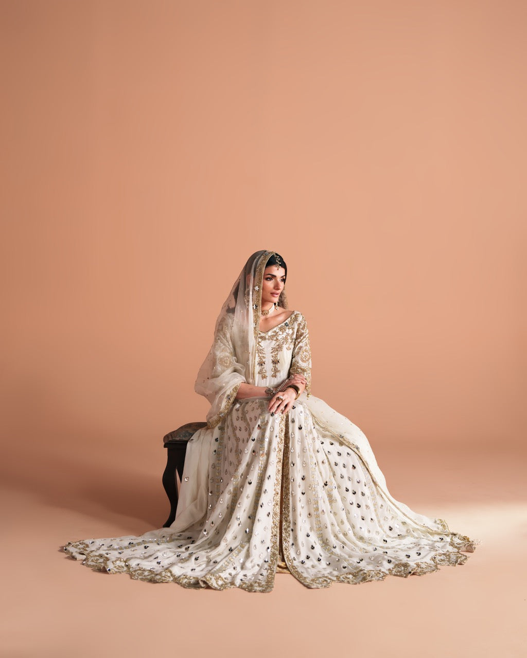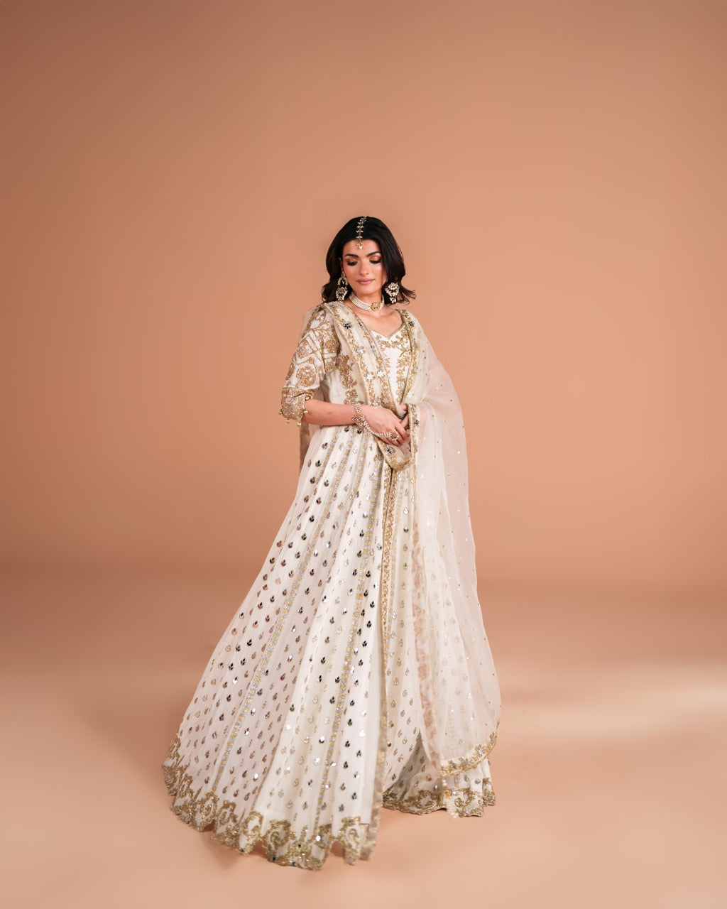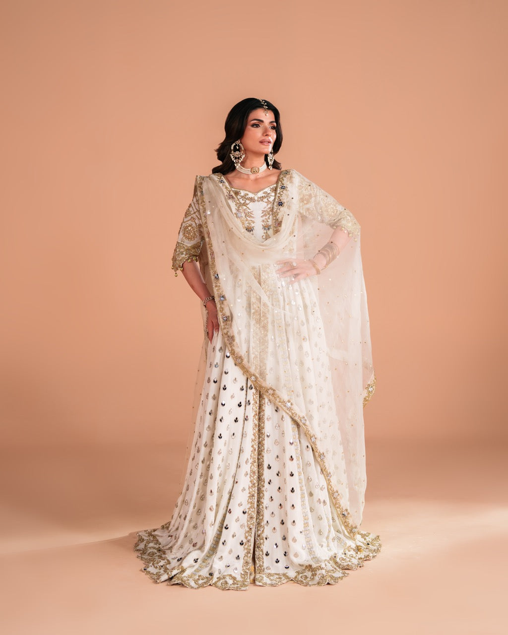 This ivory and gold ensemble weaves tradition with contemporary elegance — adorned with intricate handwork, mirror, delicate sequins, and a flowing silhouette that whispers luxury in every detail. Perfect for nikkah, day weddings, or regal celebrations
