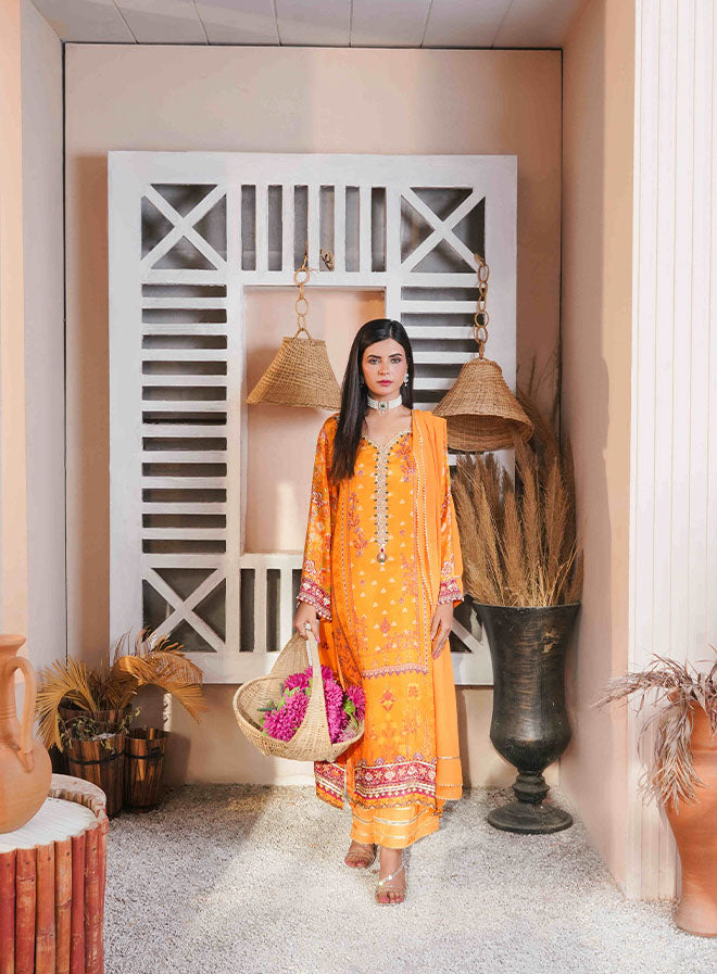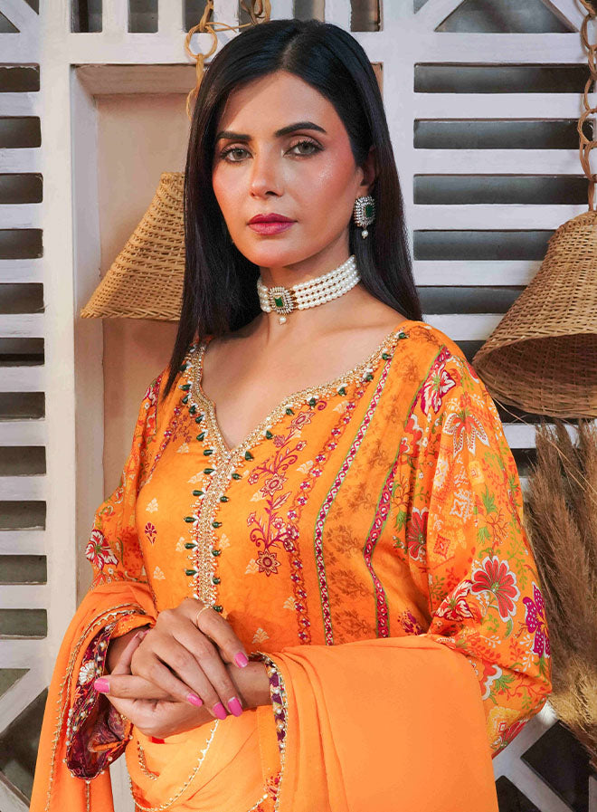 Barerah by Kehkeshan is a stunning raw silk kurta for ladies, crafted to combine elegance, comfort, and timeless style. This designer raw silk kurta features a vibrant orangish-mustard hue adorned with intricate floral motifs, while delicate gold and green bead embroidery on the neckline and sleeves adds sophistication. Paired with silk pants and a lightweight chiffon dupatta, Barerah offers a flattering 48-inch silhouette perfect for festive occasions or special gatherings. Elevate your wardrobe with this luxurious piece from the Tara collection by Kehkeshan.