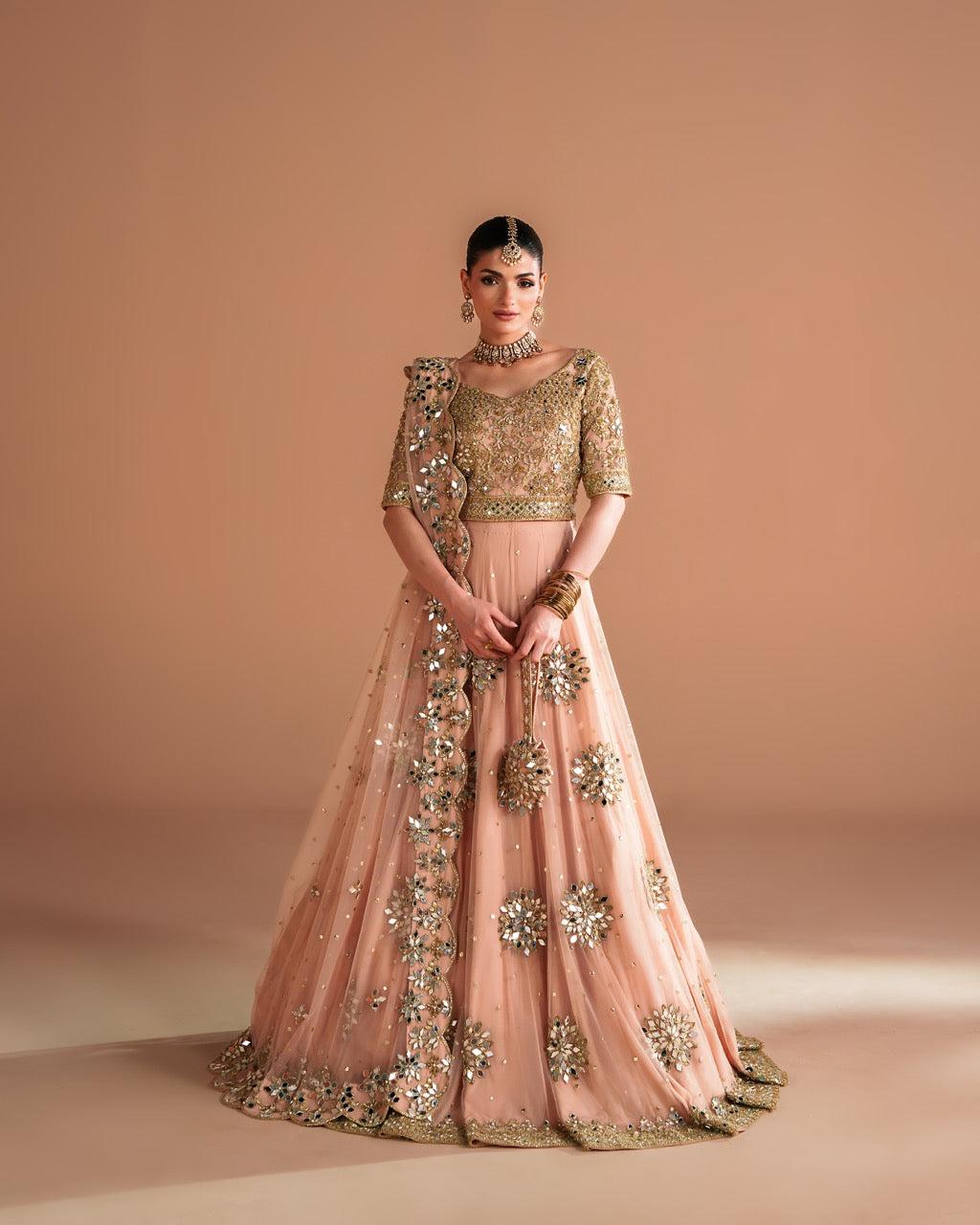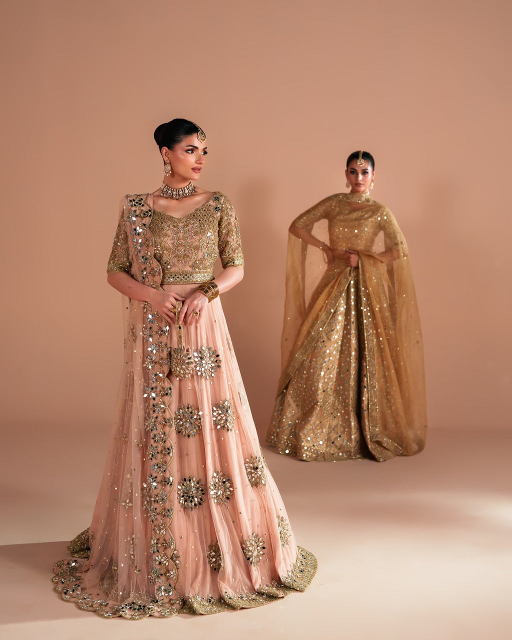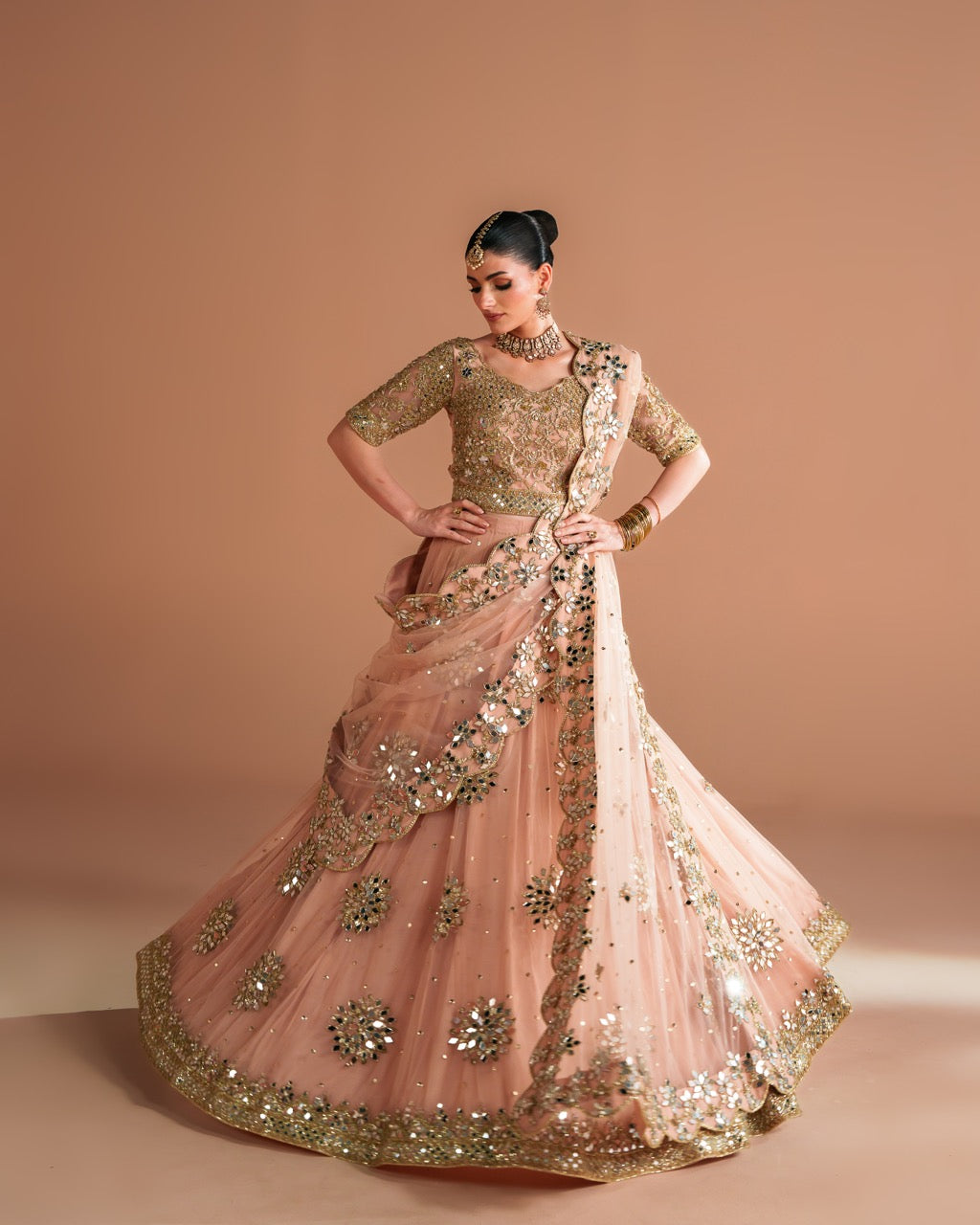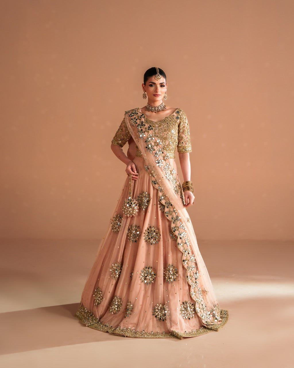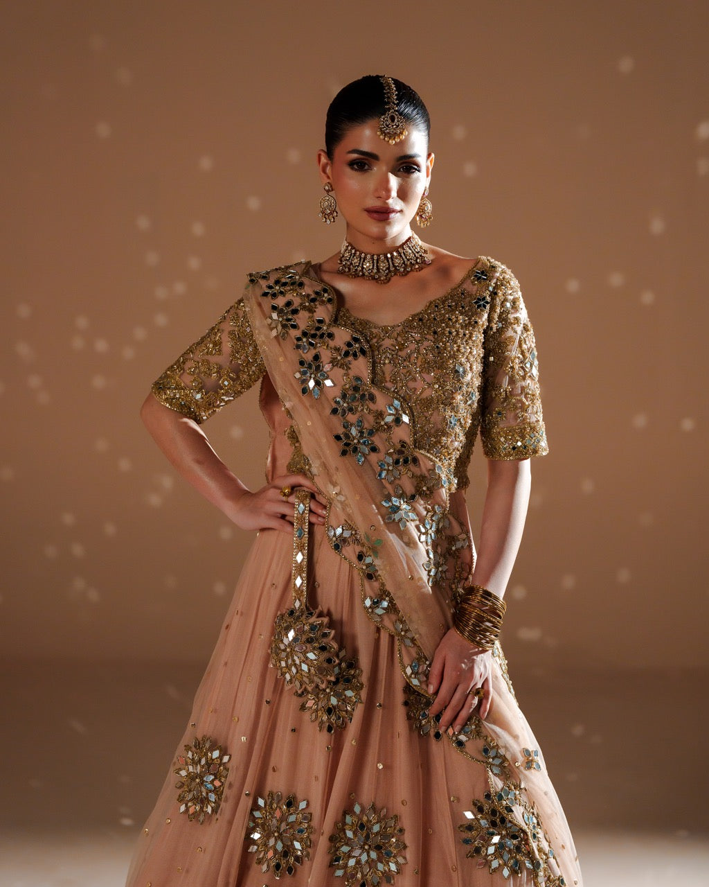 This enchanting lehenga is a masterpiece of modern romance — adorned with intricate mirrorwork, hand-embroidered florals and exquisite detailing that radiates feminine grace. Perfect for walima, engagement soirées, festive receptions, or the modern bride’s dream day