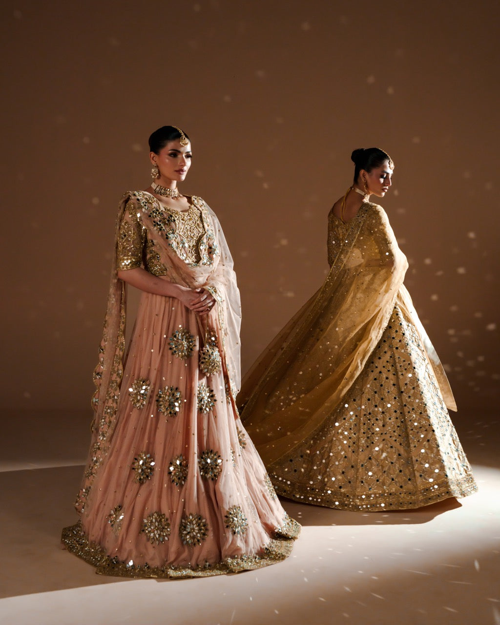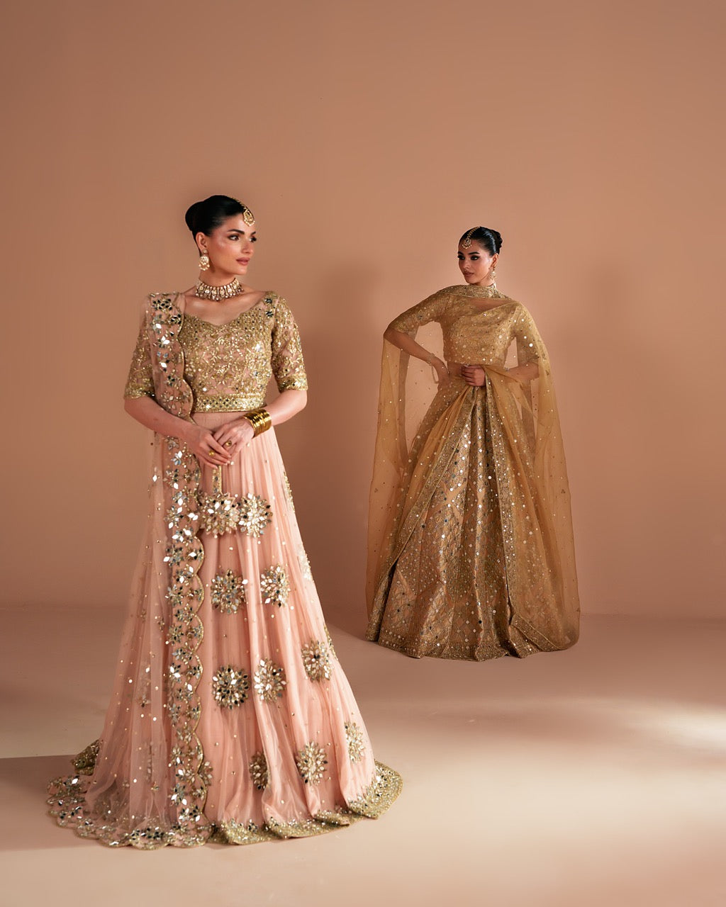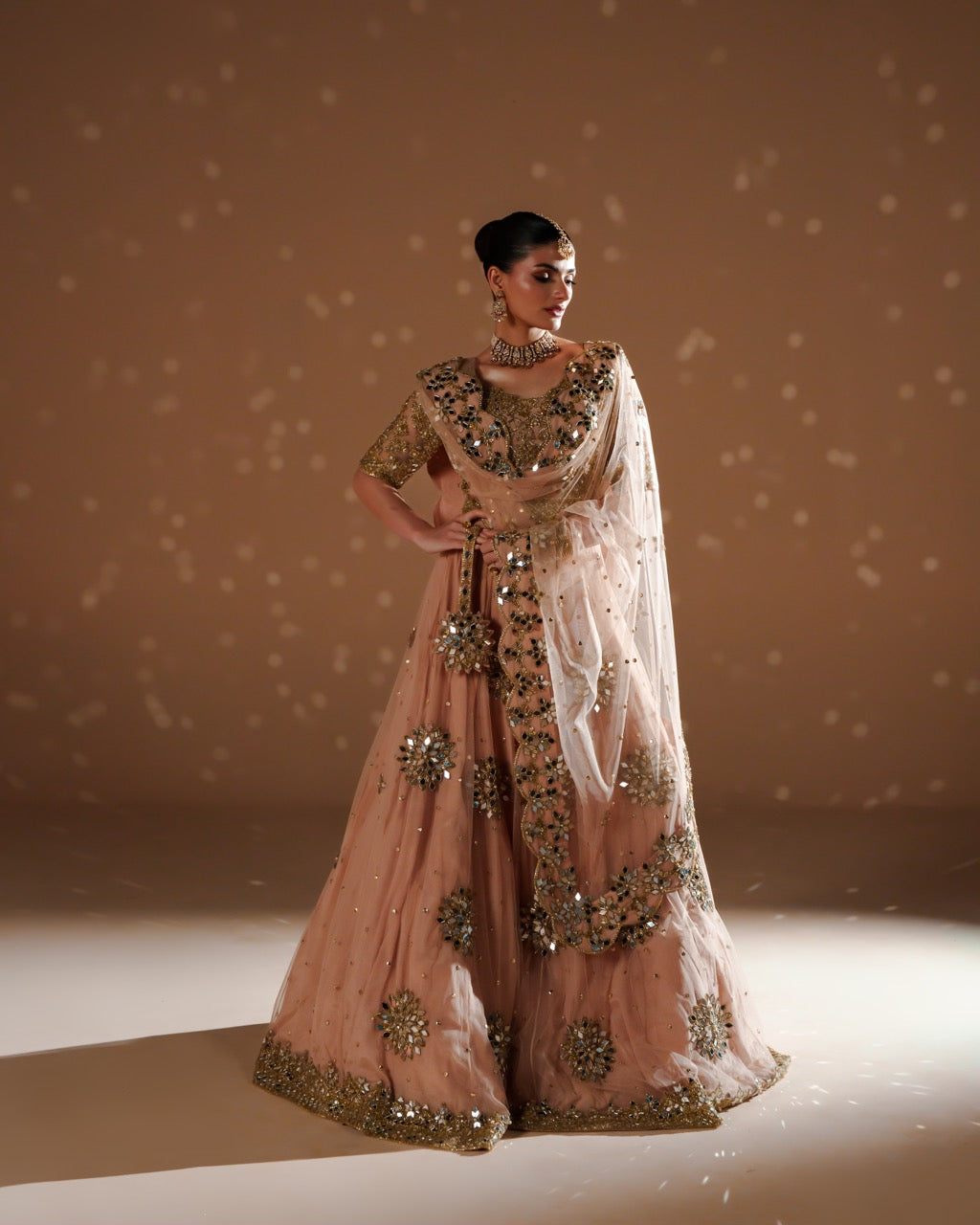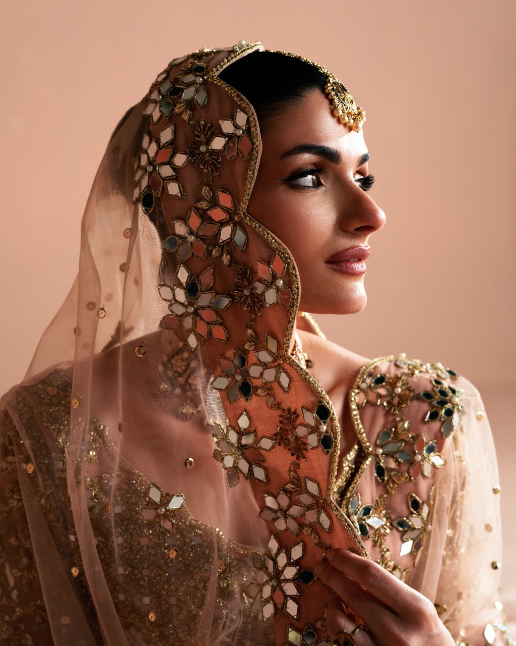 This enchanting lehenga is a masterpiece of modern romance — adorned with intricate mirrorwork, hand-embroidered florals and exquisite detailing that radiates feminine grace. Perfect for walima, engagement soirées, festive receptions, or the modern bride’s dream day