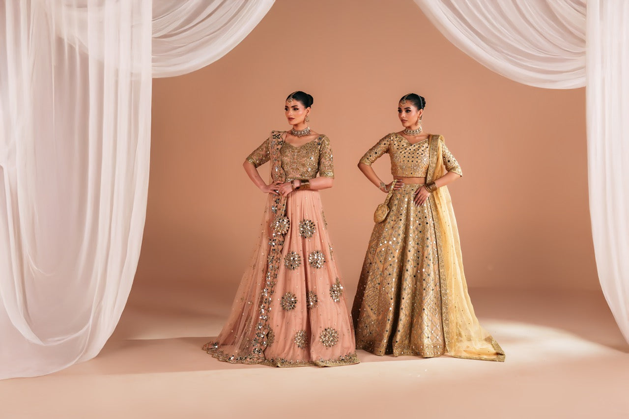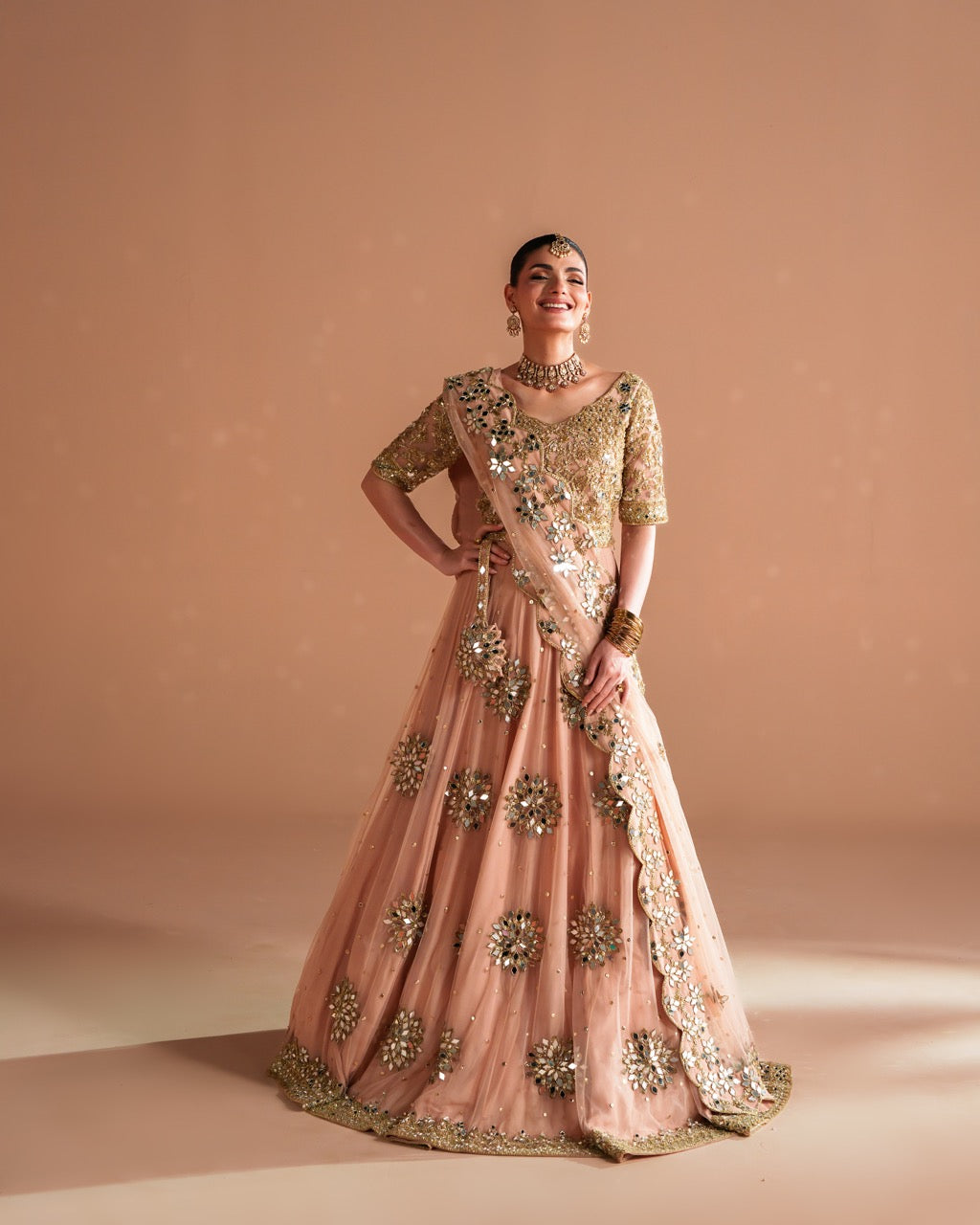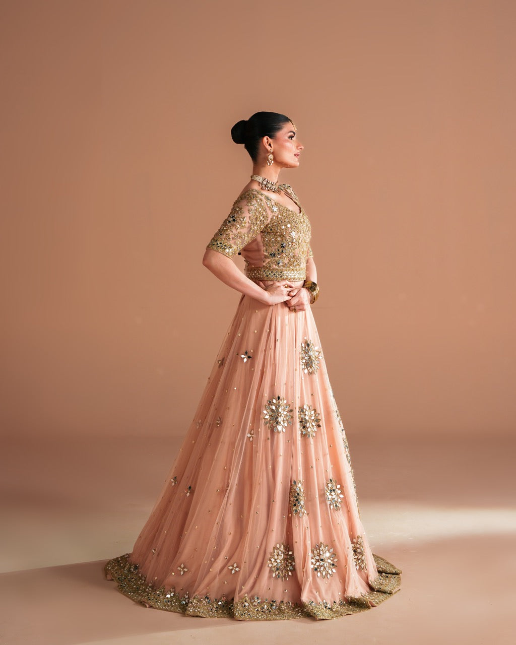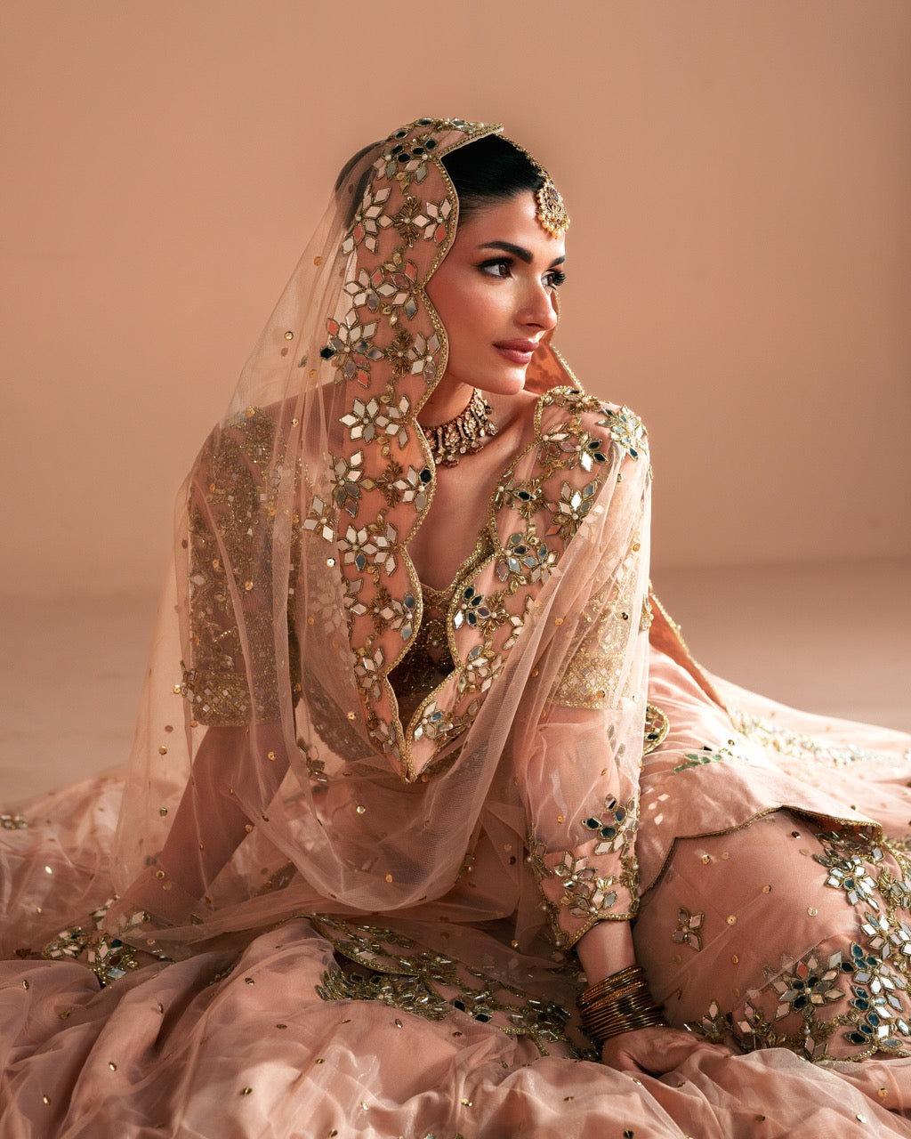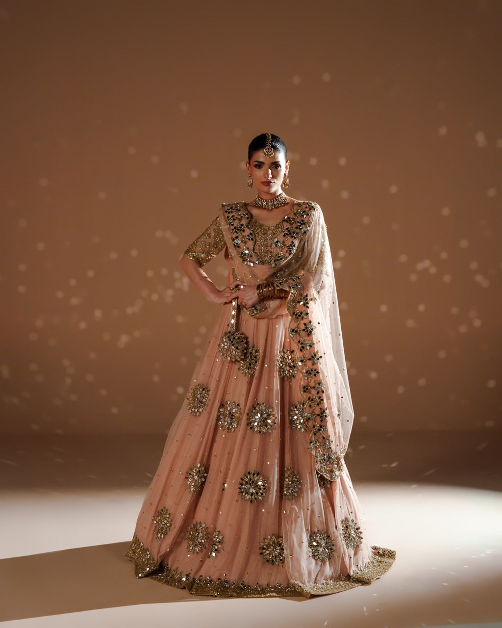 This enchanting lehenga is a masterpiece of modern romance — adorned with intricate mirrorwork, hand-embroidered florals and exquisite detailing that radiates feminine grace. Perfect for walima, engagement soirées, festive receptions, or the modern bride’s dream day