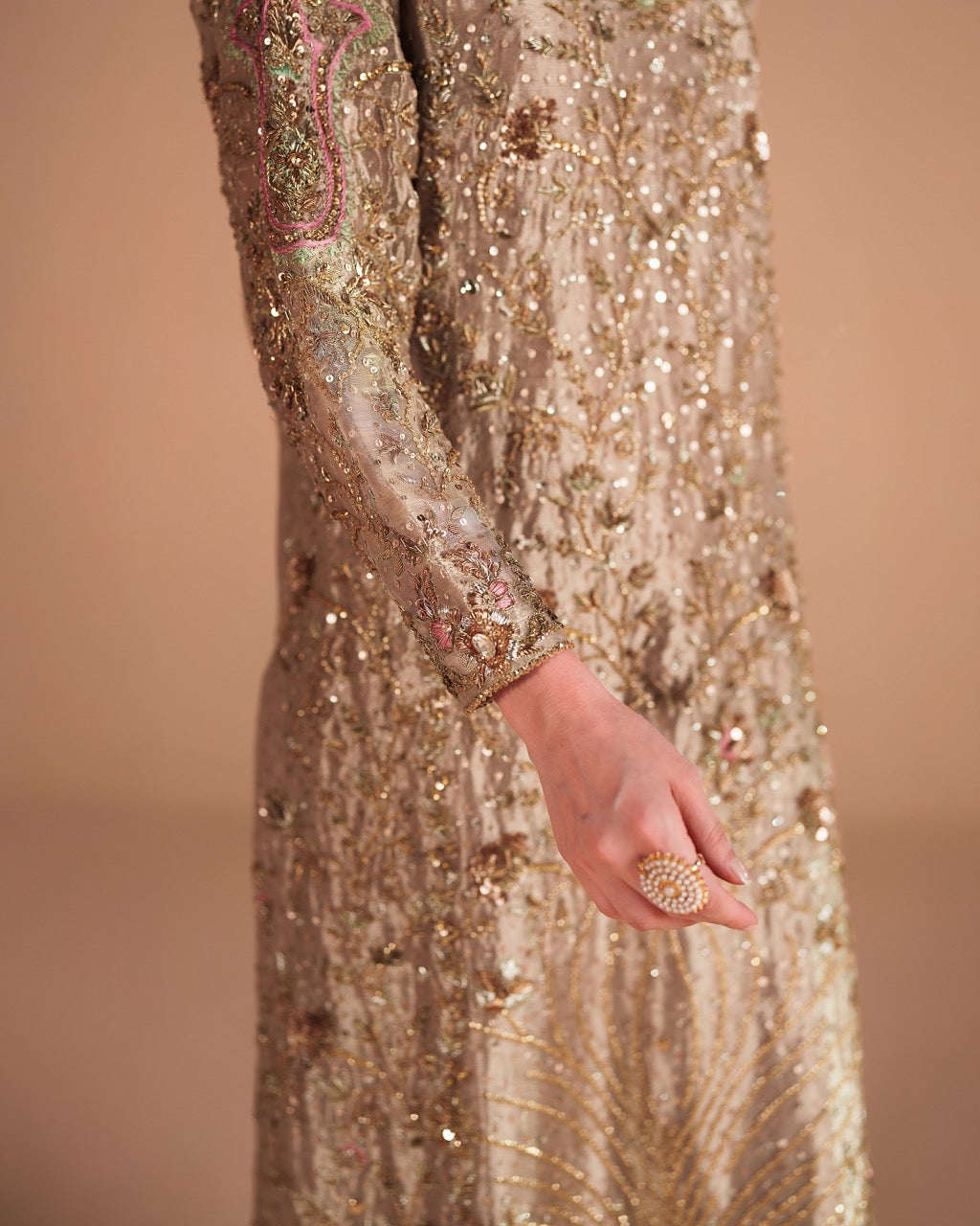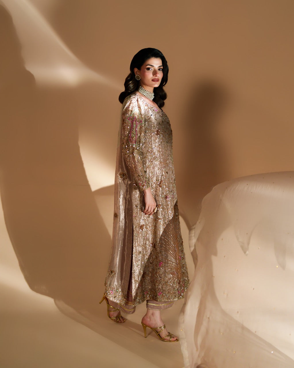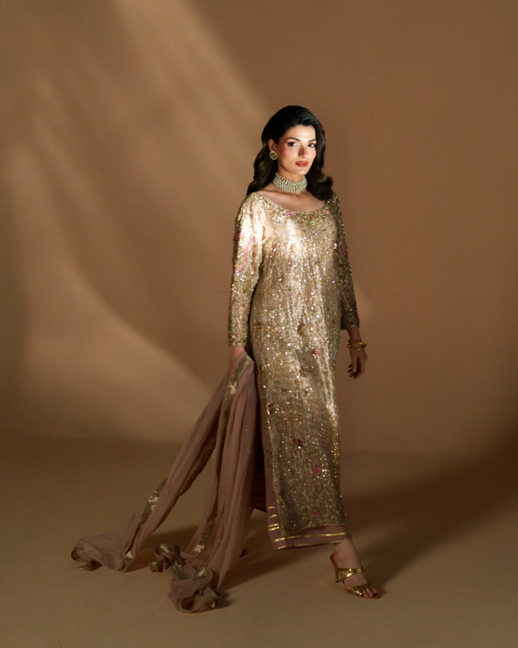 An ode to timeless grace and regal sophistication, Noor is a masterpiece crafted for those who appreciate the art of subtle grandeur. Drenched in a luxurious champagne-gold hue, this ensemble is intricately hand-embellished with delicate threadwork, shimmering sequins, and exquisite zardozi detailing. The cascading patterns create an ethereal play of light, while soft hints of blush pink embroidery add a whisper of romance and femininity