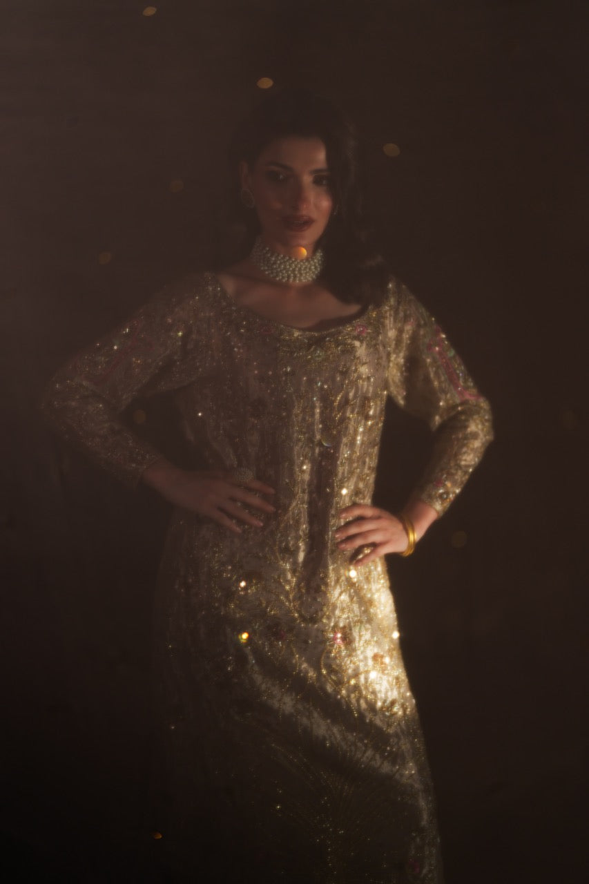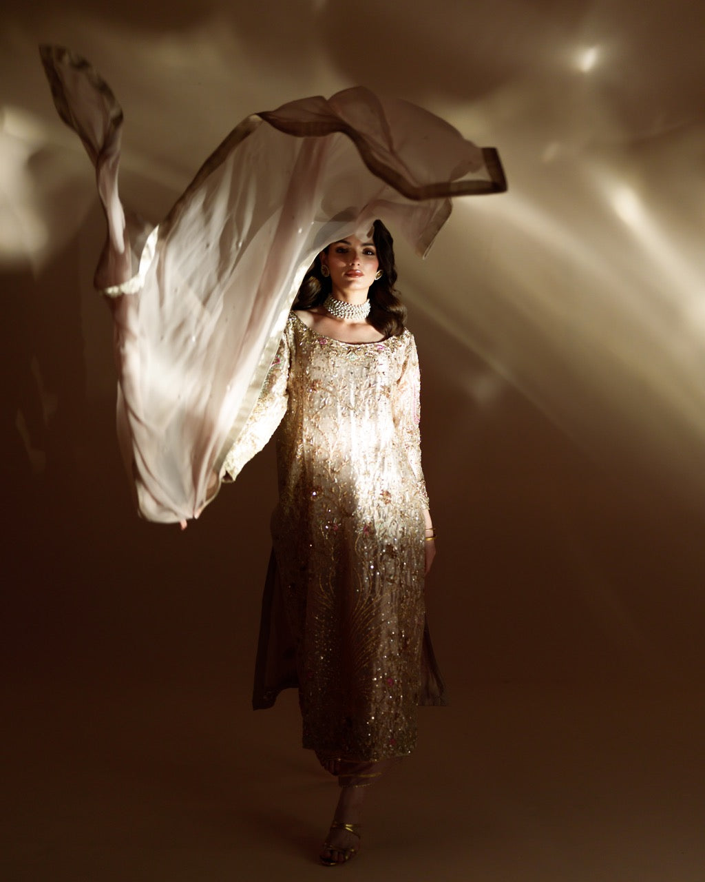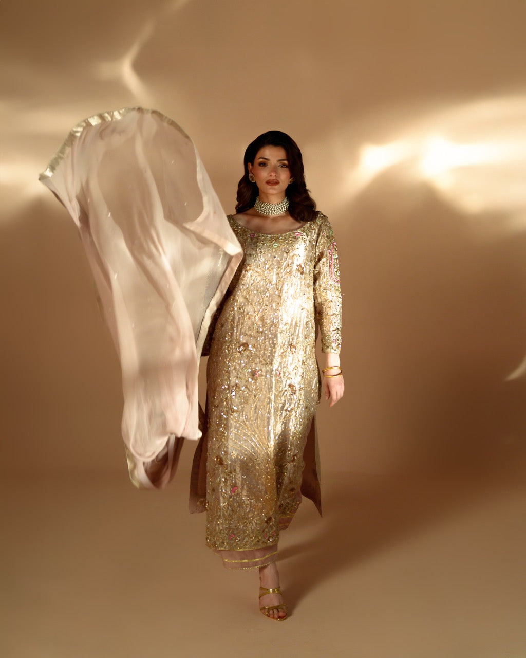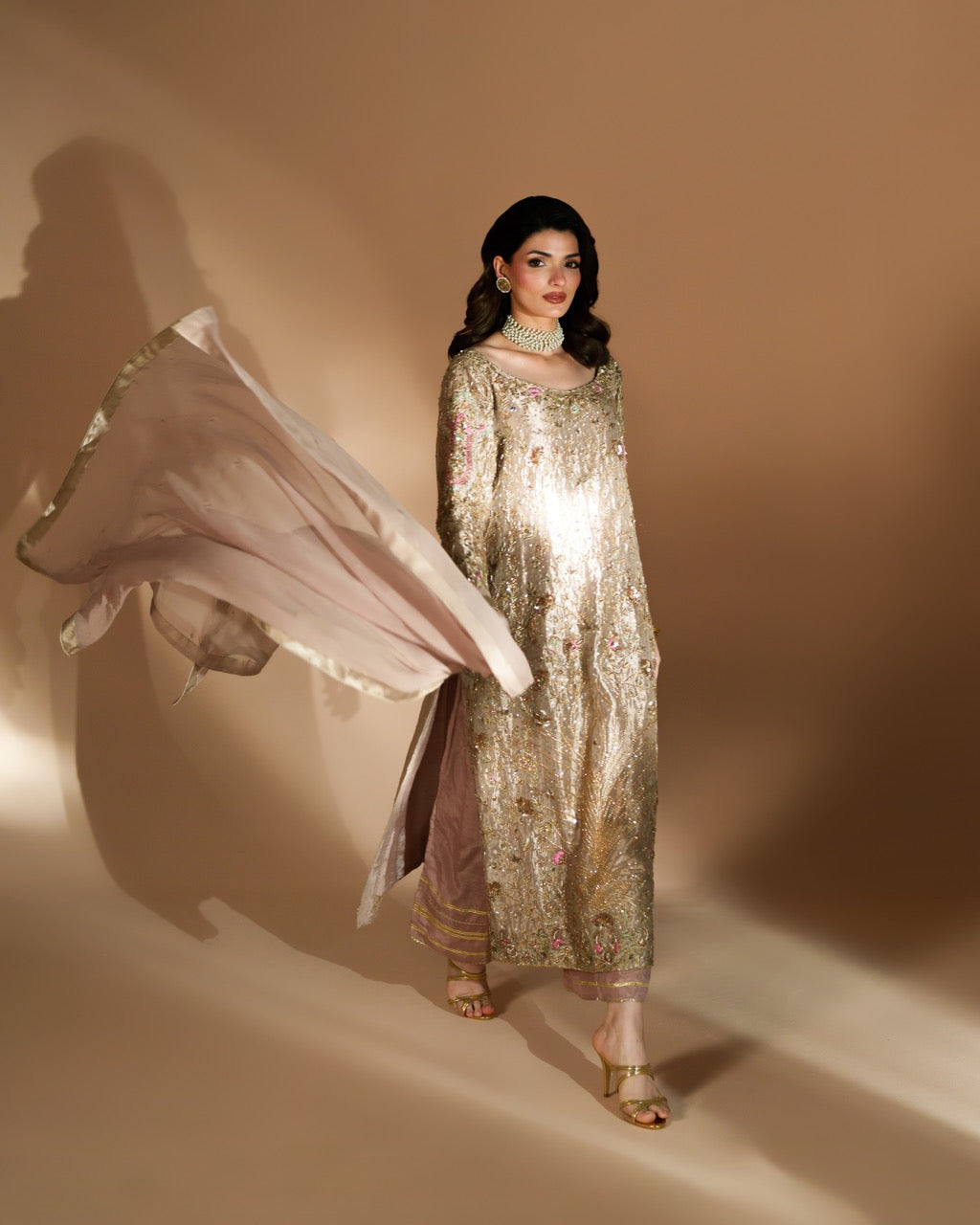 An ode to timeless grace and regal sophistication, Noor is a masterpiece crafted for those who appreciate the art of subtle grandeur. Drenched in a luxurious champagne-gold hue, this ensemble is intricately hand-embellished with delicate threadwork, shimmering sequins, and exquisite zardozi detailing. The cascading patterns create an ethereal play of light, while soft hints of blush pink embroidery add a whisper of romance and femininity
