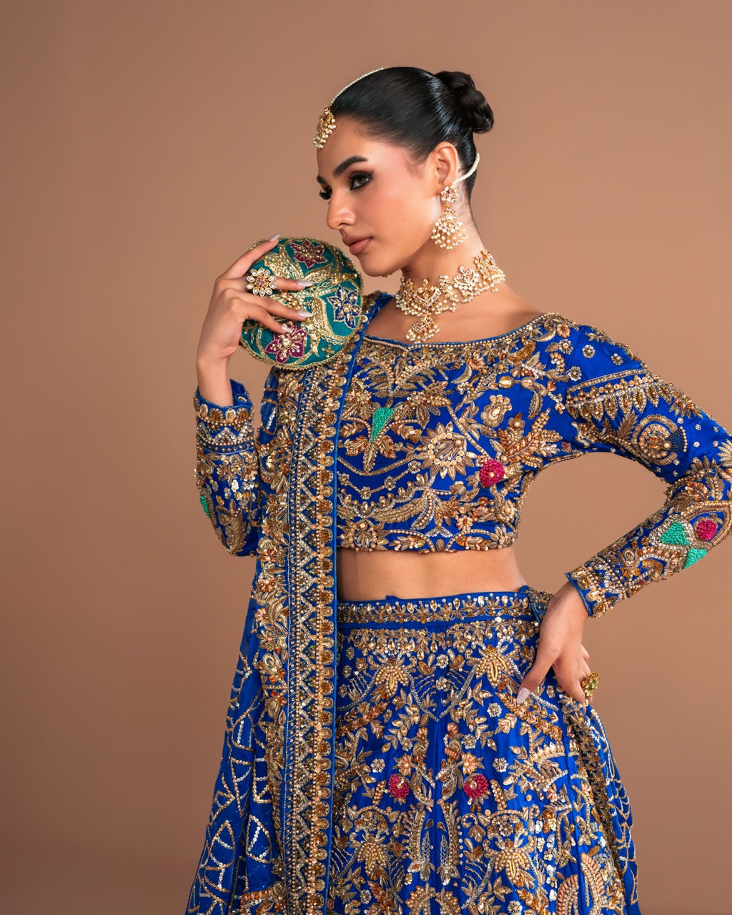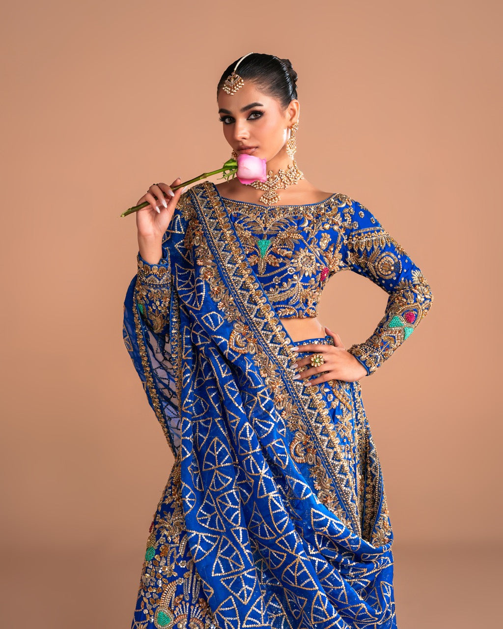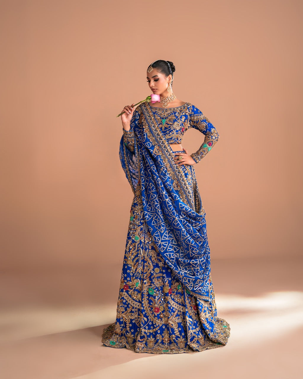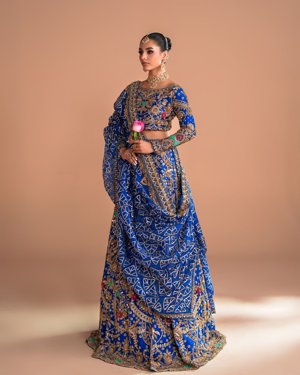 Shereen... A heavy bridal lehanga choli in a beautiful shade of blue with handwork details of dabka, qora, resham and sequence. It is a perfect choice for your big day. Dupatta centre has geometrical patterns and handworked border on all four sides.