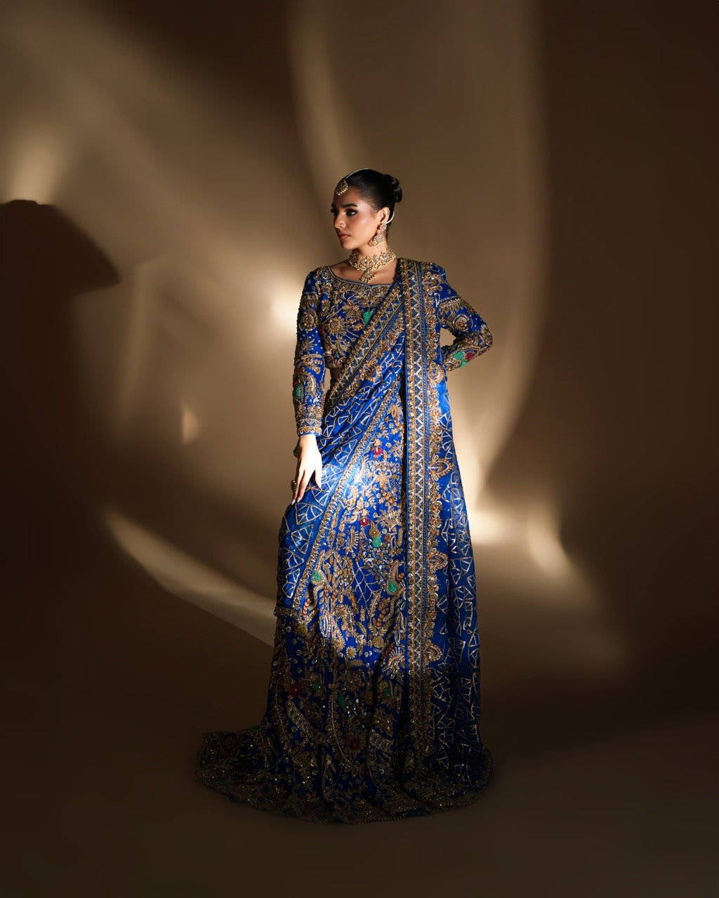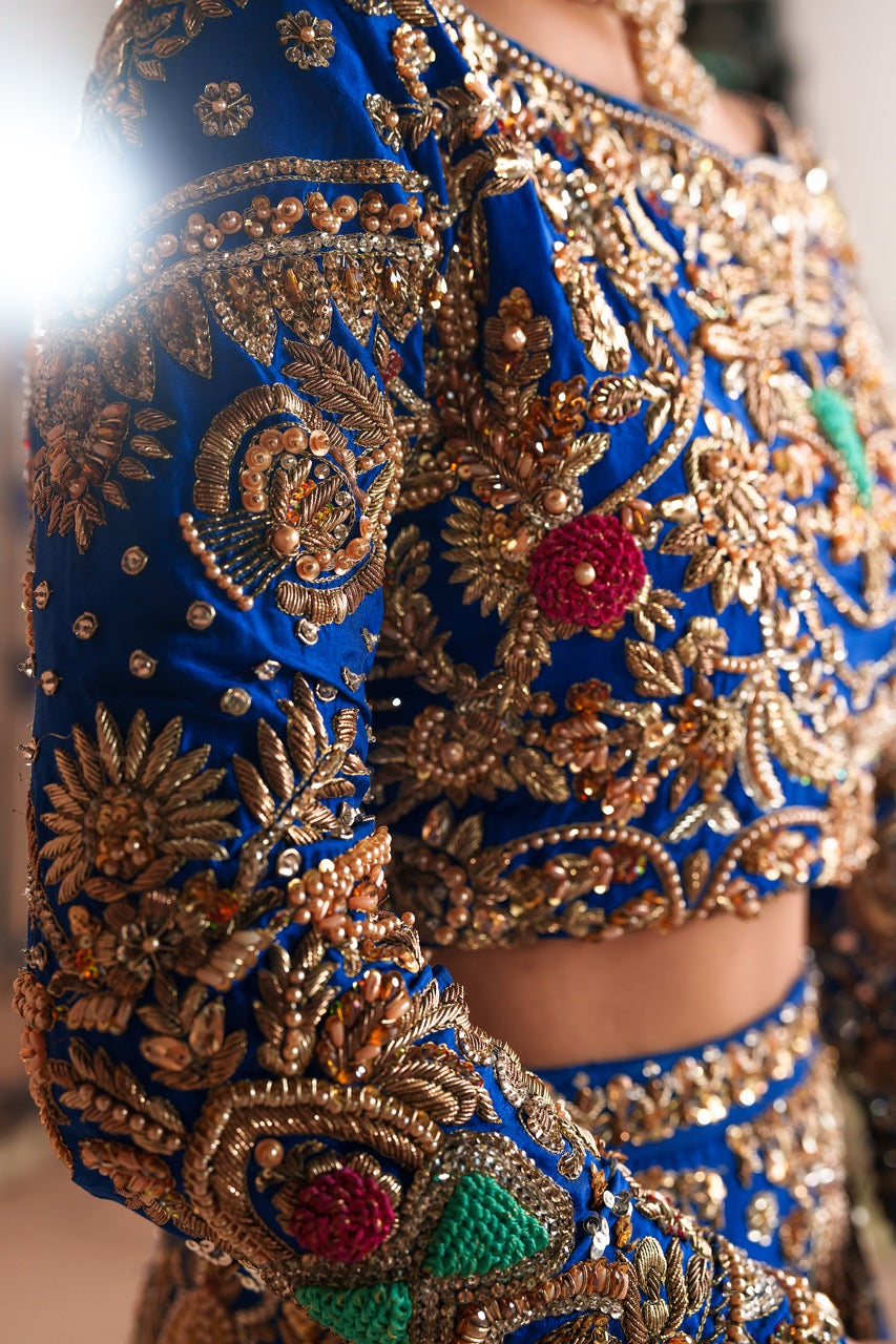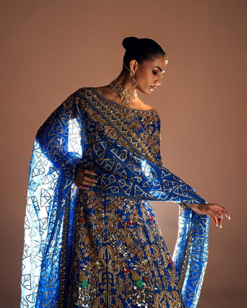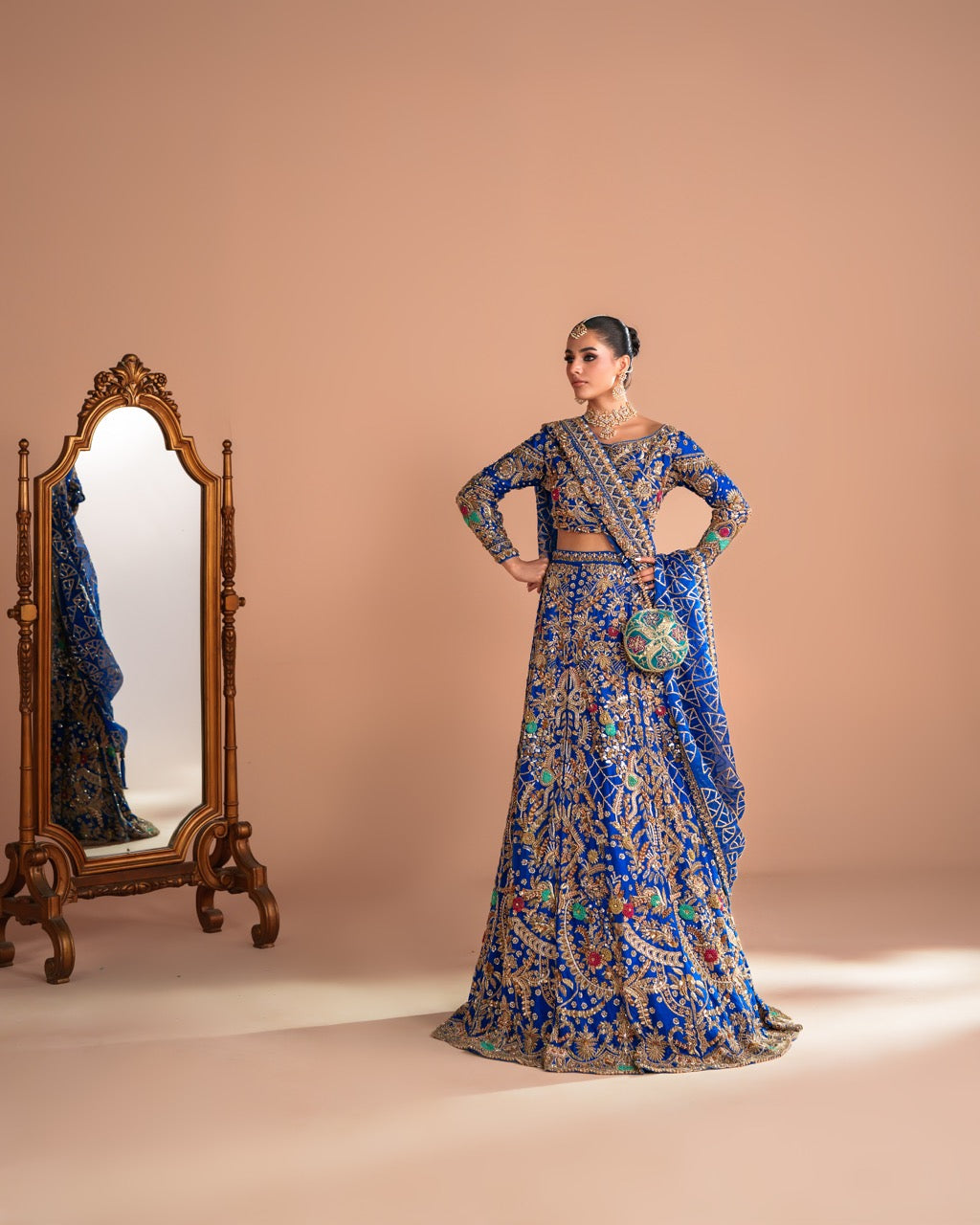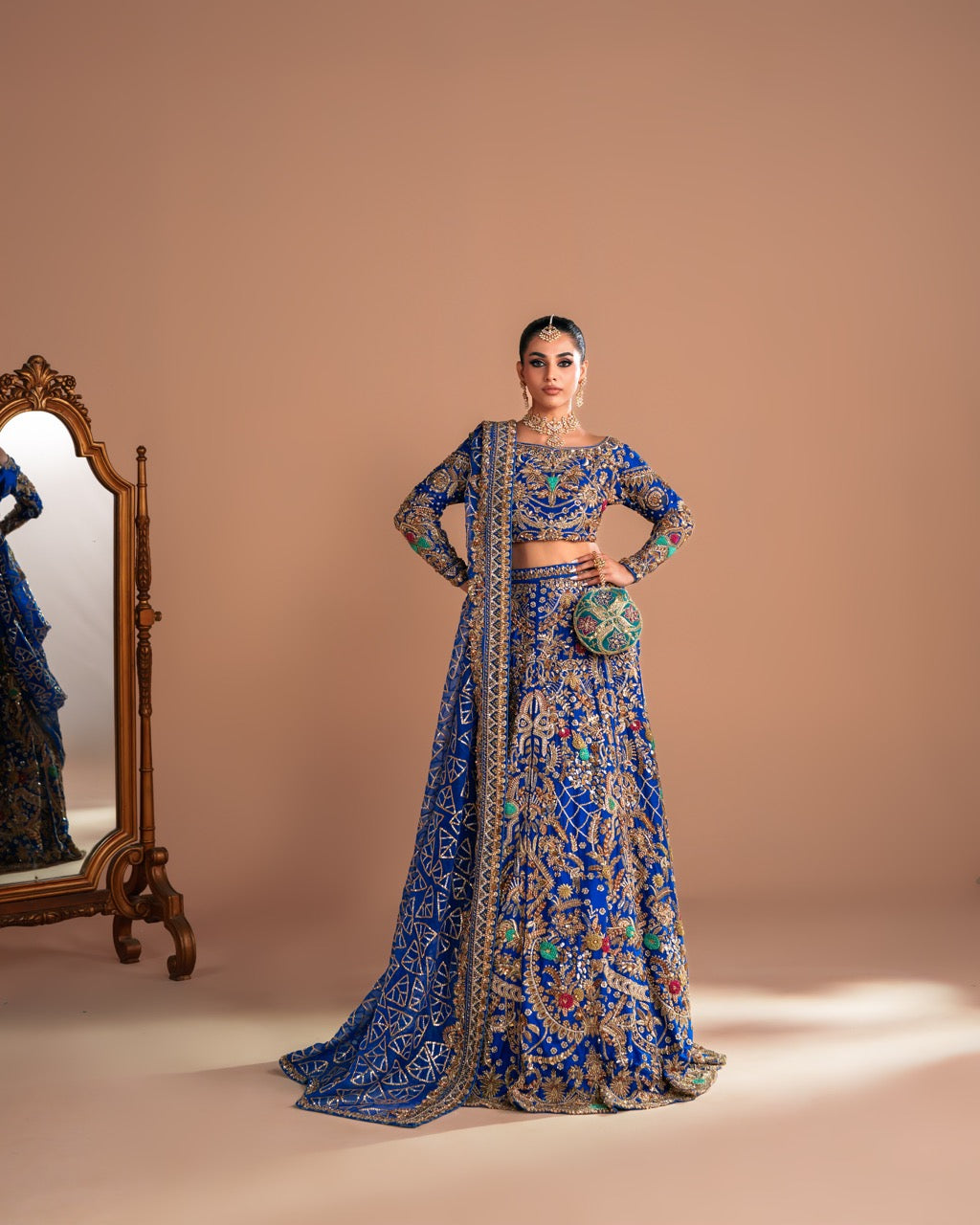 Shereen... A heavy bridal lehanga choli in a beautiful shade of blue with handwork details of dabka, qora, resham and sequence. It is a perfect choice for your big day. Dupatta centre has geometrical patterns and handworked border on all four sides.