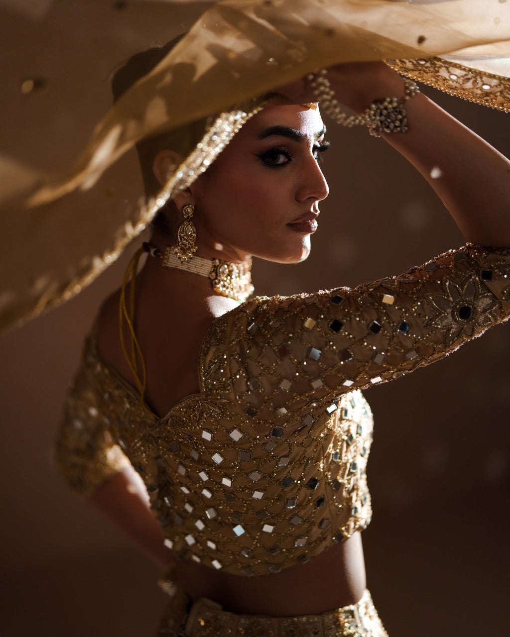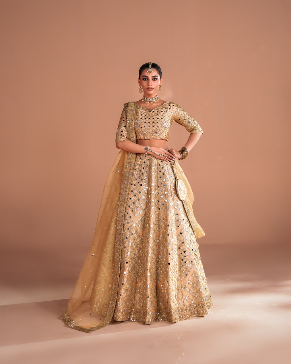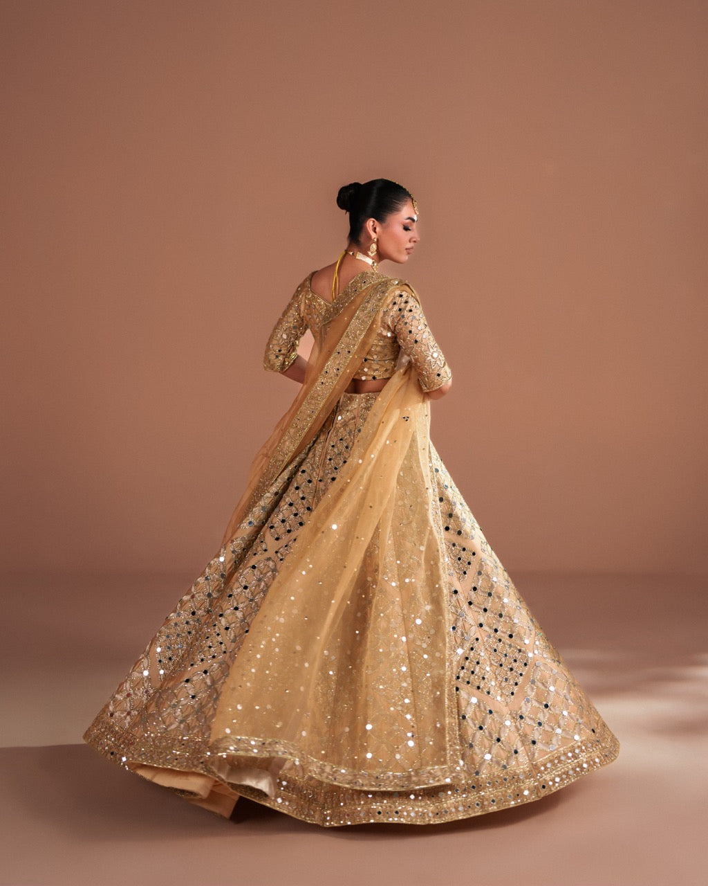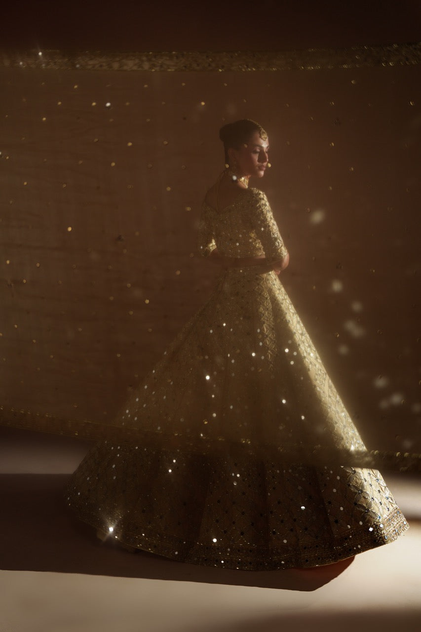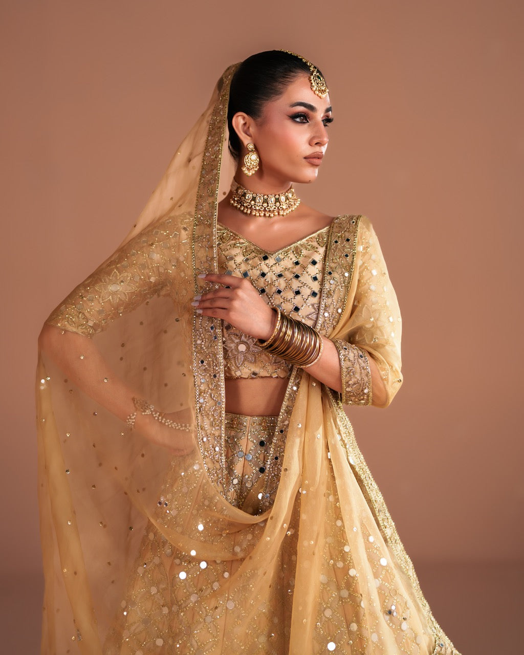 This breathtaking lehenga is a celebration of opulence — drenched in luminous gold tones, adorned with mirrorwork, sequins, dabka and intricate embellishments that catch every flicker of light. A statement piece for the bride who desires timeless grandeur with a modern edge