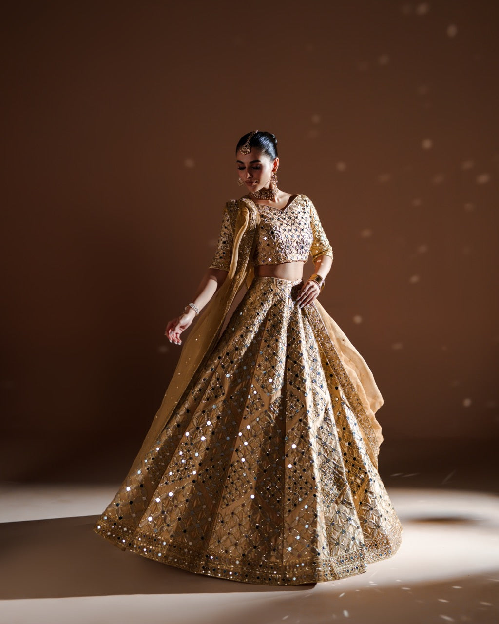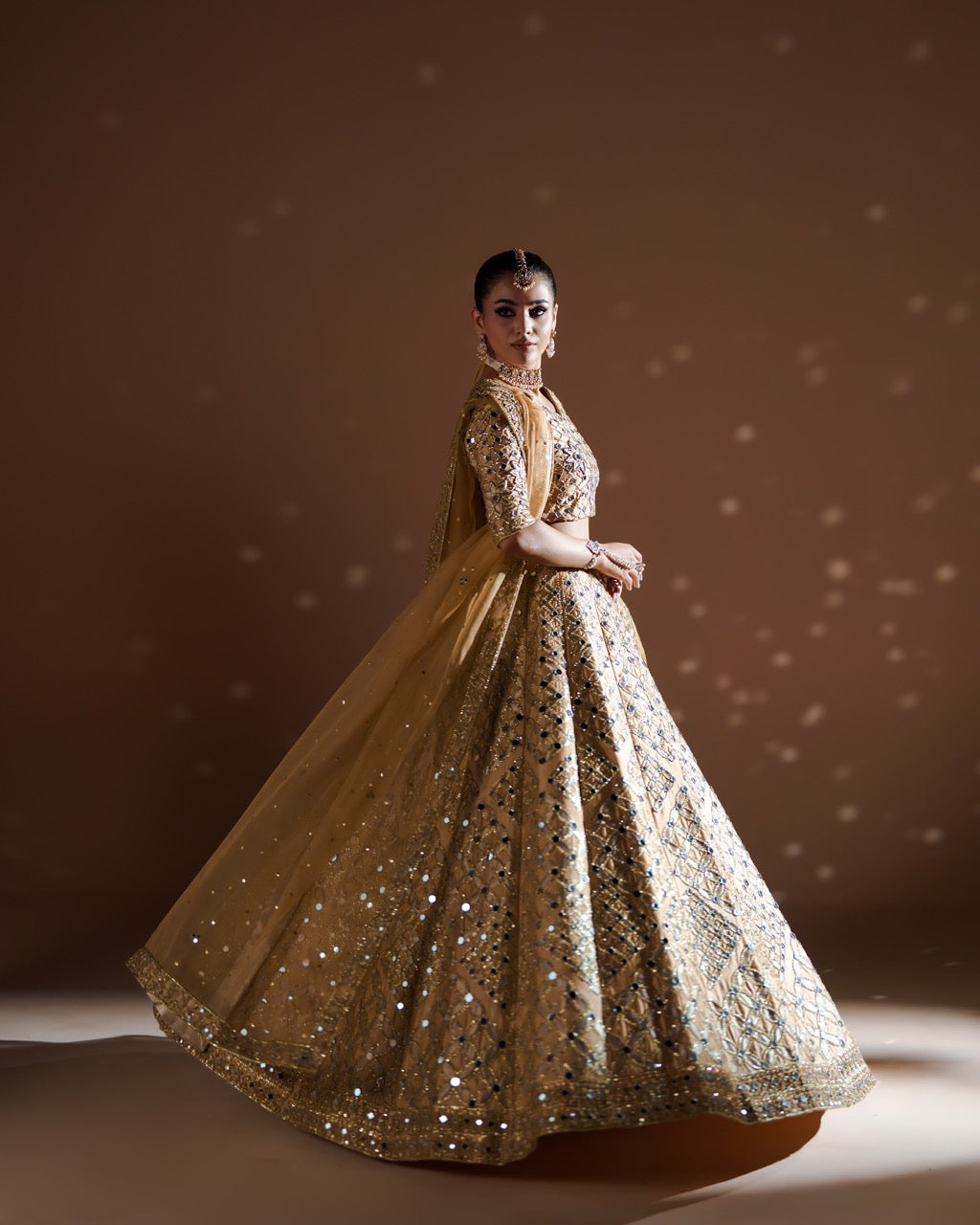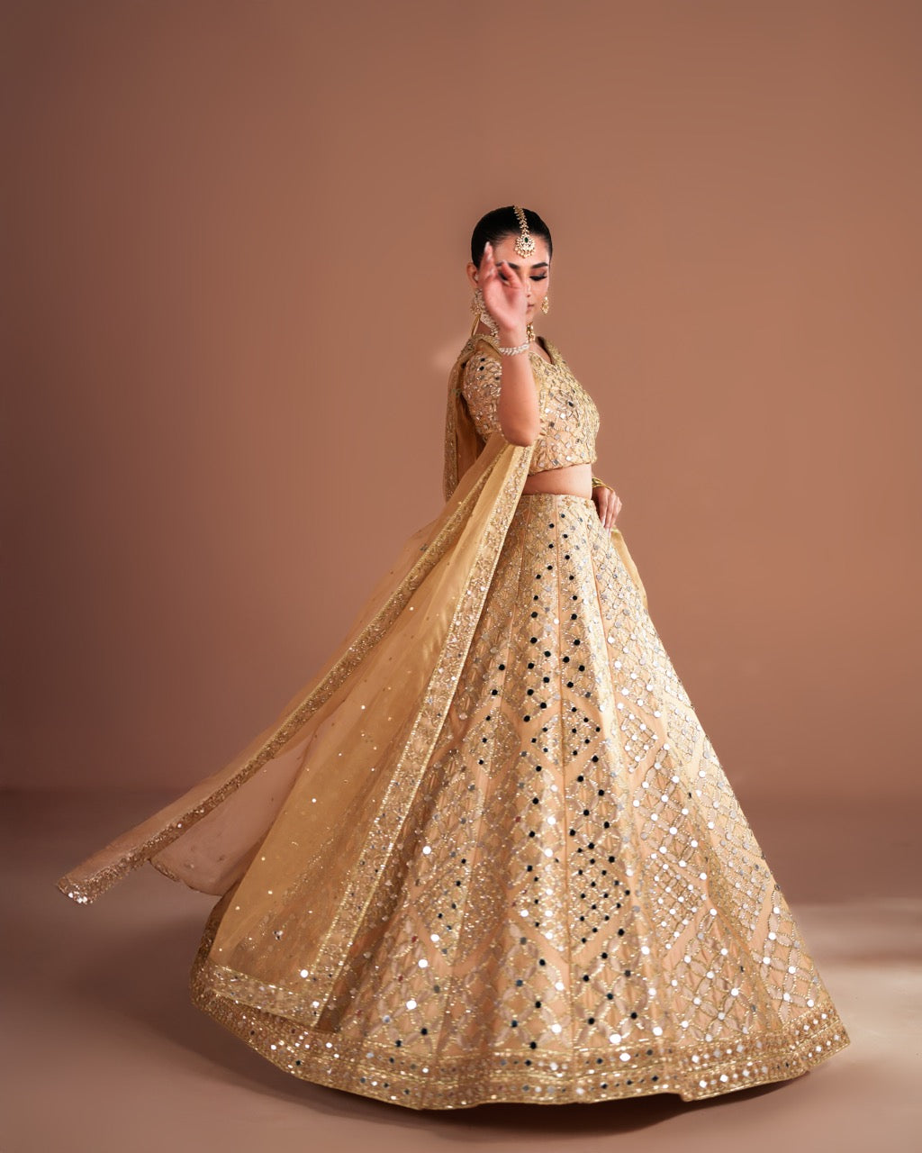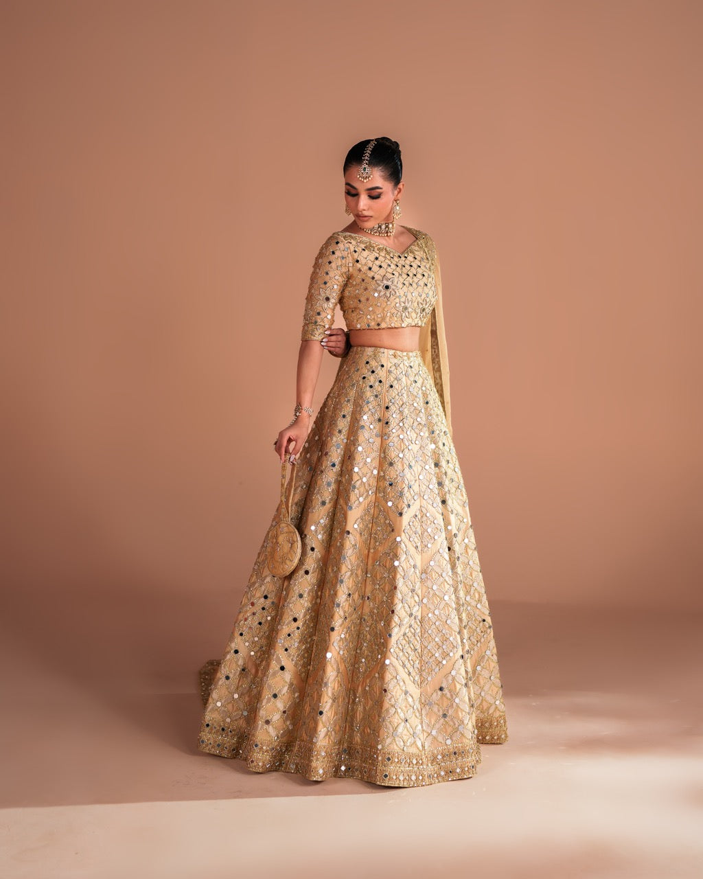 This breathtaking lehenga is a celebration of opulence — drenched in luminous gold tones, adorned with mirrorwork, sequins, dabka and intricate embellishments that catch every flicker of light. A statement piece for the bride who desires timeless grandeur with a modern edge