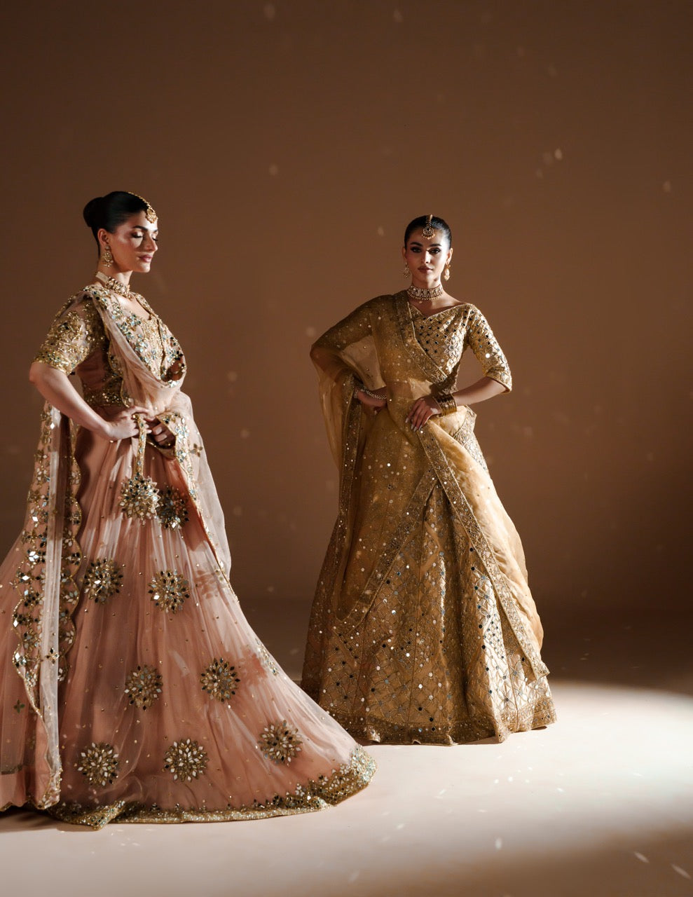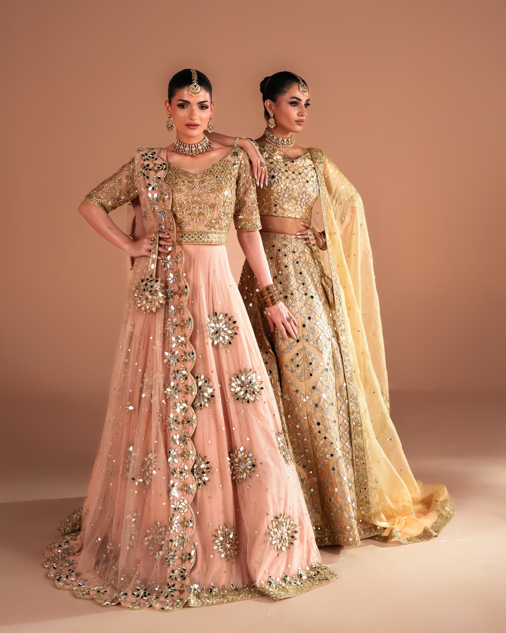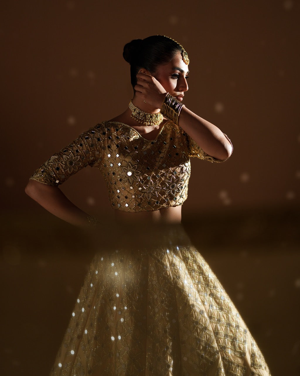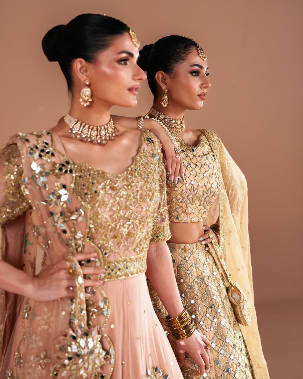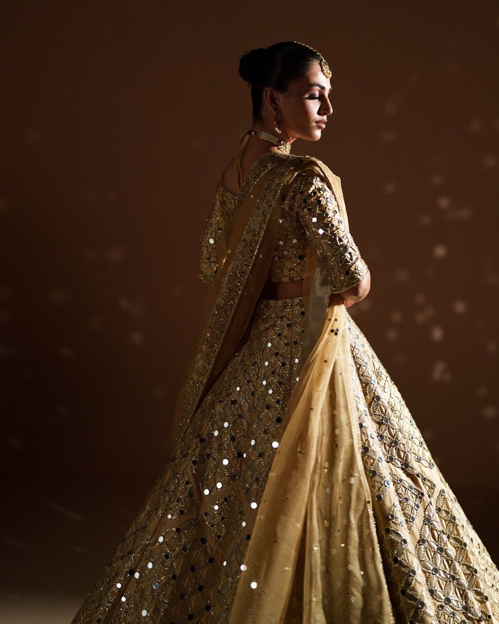 This breathtaking lehenga is a celebration of opulence — drenched in luminous gold tones, adorned with mirrorwork, sequins, dabka and intricate embellishments that catch every flicker of light. A statement piece for the bride who desires timeless grandeur with a modern edge